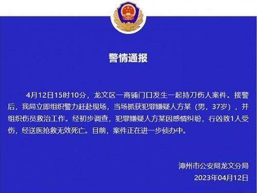 ·漳州公安通報(bào)萬達(dá)砍人案:男子因感情糾紛行兇致一人死亡,被當(dāng)場抓獲。