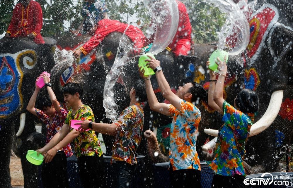當(dāng)?shù)貢r(shí)間2023年4月11日,泰國大城府,大象與游客相互潑水,歡度潑水節(jié)。