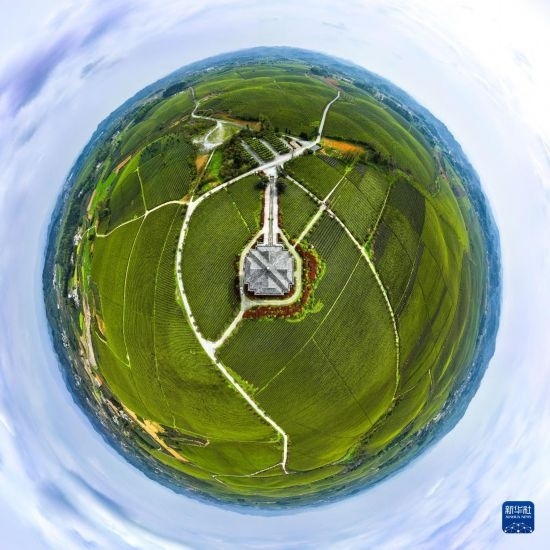 4月4日拍攝的遵義市湄潭縣永興鎮(zhèn)“萬畝茶?!保o人機全景拼接照片)。