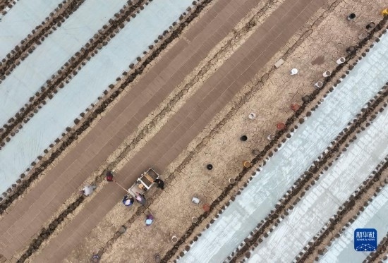 4月18日,唐山市豐南區(qū)西葛鎮(zhèn)的農(nóng)民在田間使用機械設(shè)備育秧(無人機照片)。