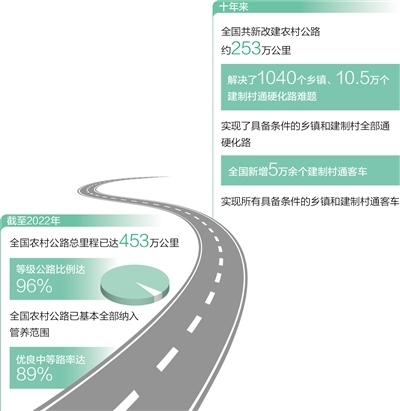 一條條“四好農(nóng)村路”修到村頭,通到了鄉(xiāng)親們的家門口。截至2022年,全國農(nóng)村公路總里程已達(dá)453萬公里,等級公路比例達(dá)96%。十年來,我國支持貧困地區(qū)新改建了6.5萬公里資源路、旅游路、產(chǎn)業(yè)路。