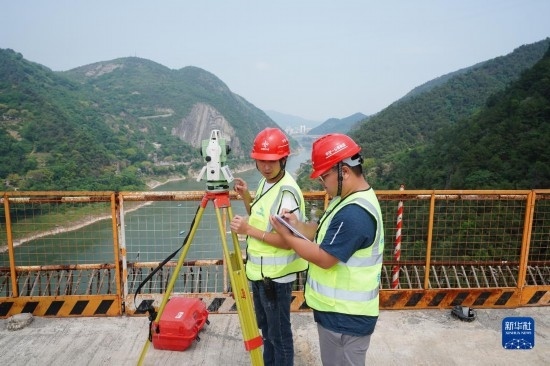 5月4日,在重慶市北碚區(qū)渝武高速復(fù)線觀音峽嘉陵江特大橋,中交一公局四公司橋梁工區(qū)工作人員孫培耕(右)和彭昭屏在對(duì)橋面高程及軸線偏位進(jìn)行測(cè)量。