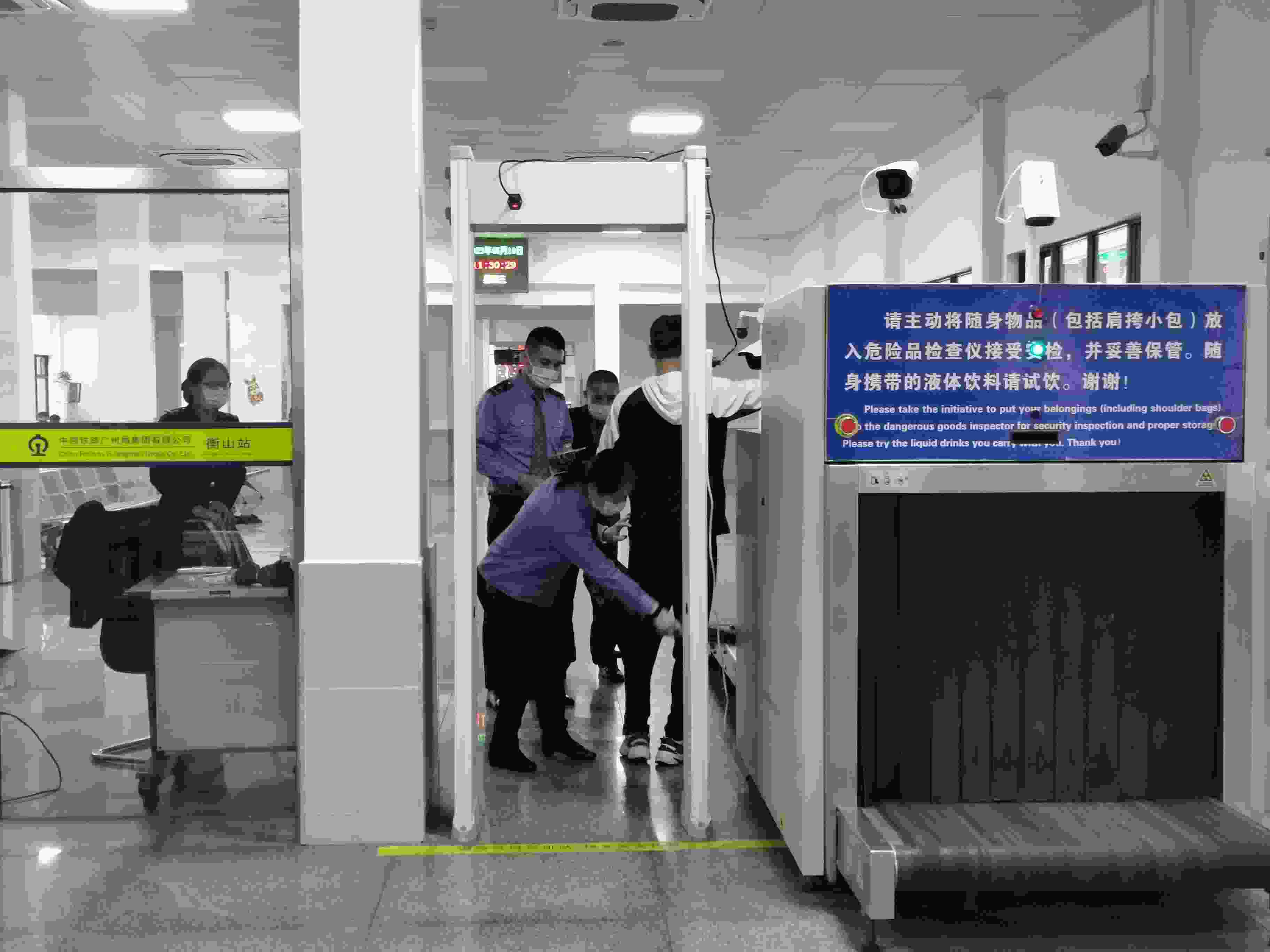 從整體的安檢流程來看,作為三等站的衡山站與其他火車站并無區(qū)別。澎湃新聞?dòng)浾咴谶@里發(fā)現(xiàn),進(jìn)站口的安檢區(qū)域有兩臺(tái)X射線安檢儀,客流量不大時(shí)一般只使用一臺(tái)。旅客進(jìn)站時(shí),首先要經(jīng)工作人員檢驗(yàn)身份證件,然后將攜帶的包裹等物品放入滾動(dòng)的X射線安檢儀。旅客自己通過安檢門后,手持金屬探測(cè)器的工作人員會(huì)對(duì)其進(jìn)行掃描檢查。
