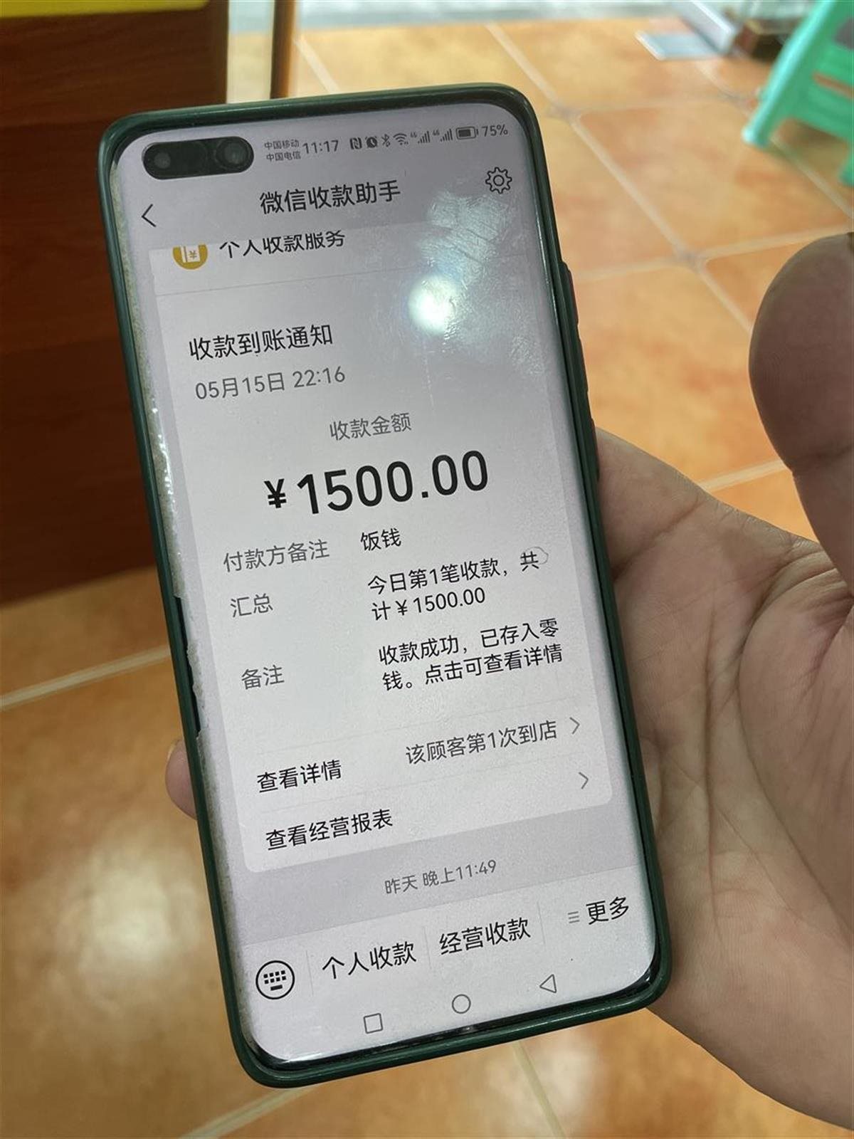 肖先生出示的收款記錄顯示,5月15日22點16分,收到飯錢1500元。
