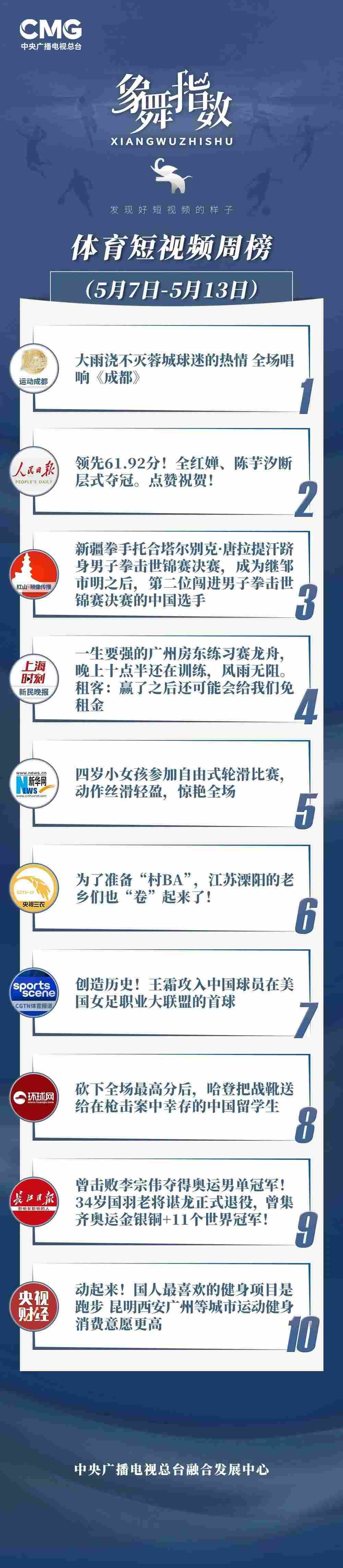 象舞指數(shù)|體育短視頻周榜(5月7日—5月13日)