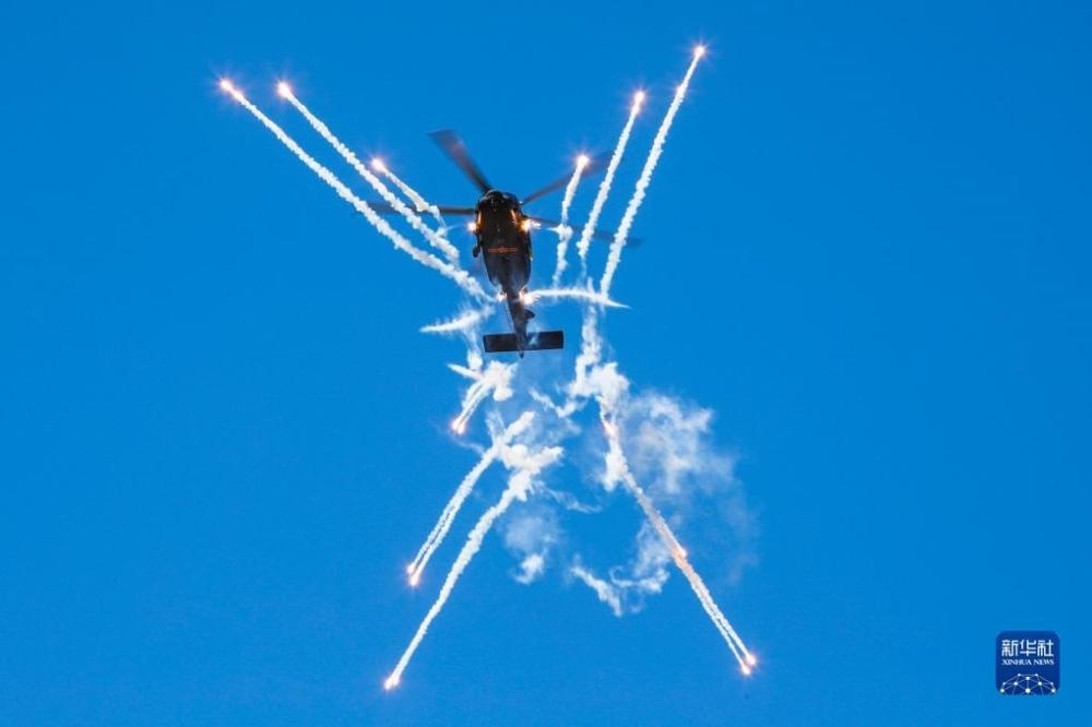 在第六屆中國天津國際直升機(jī)博覽會開幕式上,陸軍“風(fēng)雷”飛行表演隊(duì)直-20戰(zhàn)術(shù)通用直升機(jī)發(fā)射干擾彈。?