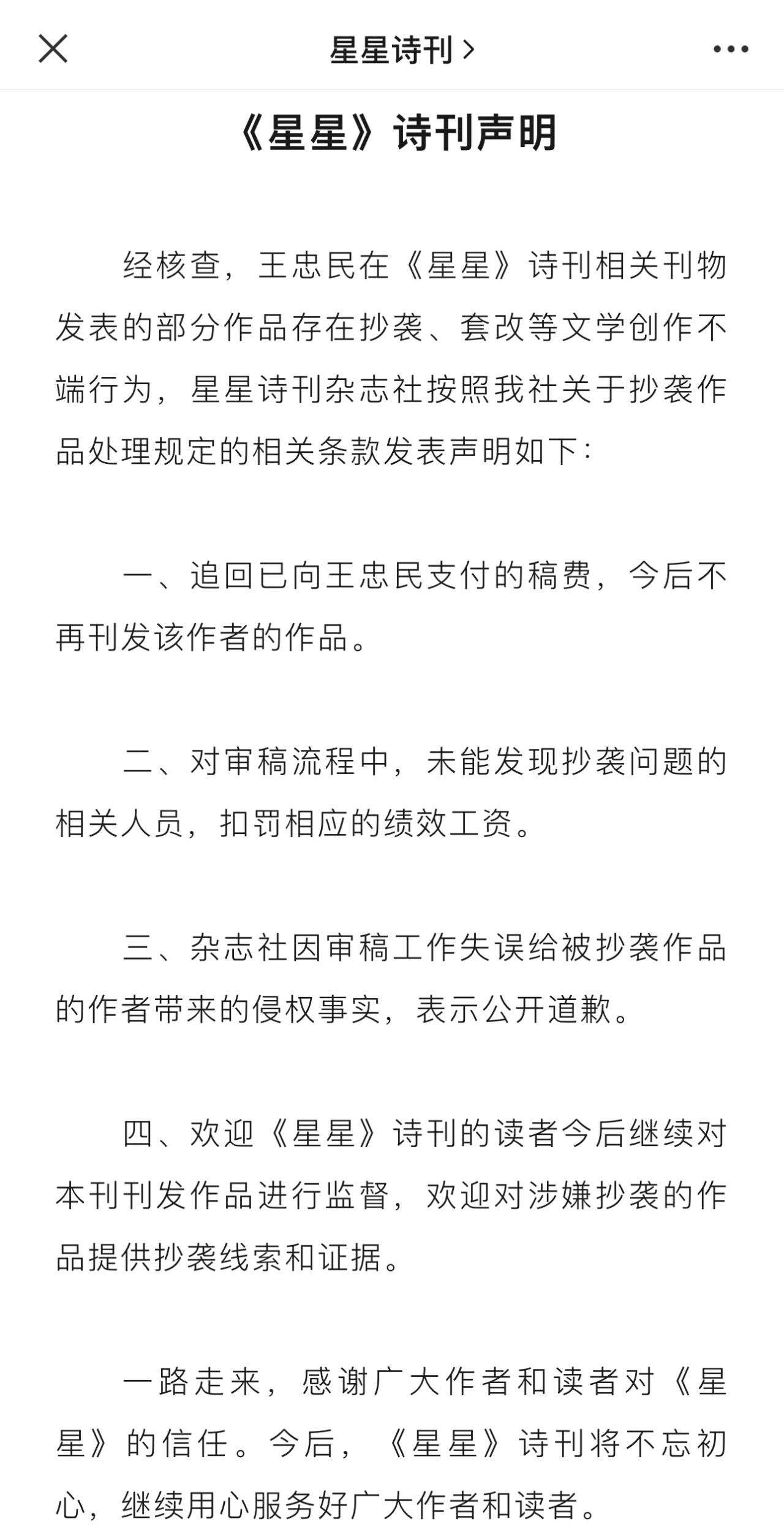 《星星》詩刊雜志社稱,按照該社關(guān)于抄襲作品處理規(guī)定的相關(guān)條款,追回已向王忠民支付的稿費(fèi),今后不再刊發(fā)該作者的作品;對(duì)審稿流程中,未能發(fā)現(xiàn)抄襲問題的相關(guān)人員,扣罰相應(yīng)的績(jī)效工資。