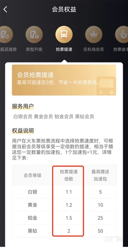 記者發(fā)現(xiàn),在另一個(gè)第三方購票平臺(tái),會(huì)員分為普通、白銀、黃金、鉑金、黑鉆等不同等級(jí),不同等級(jí)享受不同權(quán)益。從搶票提速這一權(quán)益來看,普通會(huì)員并未享受搶票提速這一權(quán)益,而白銀到黑鉆會(huì)員的搶票速度則依次提高1.1倍、1.2倍、1.5倍、2倍。