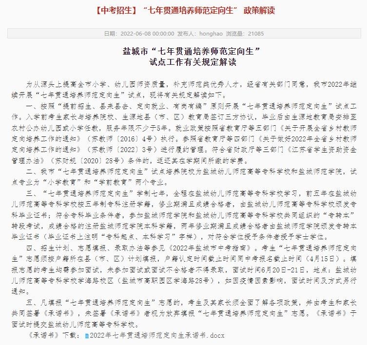 記者從鹽城幼兒師范高等??茖W(xué)校官網(wǎng)看到,鹽城市從2021年起開始試點(diǎn)培養(yǎng)“七年貫通師范定向生”,試點(diǎn)培養(yǎng)院校為鹽城幼兒師范高等專科學(xué)校和鹽城師范學(xué)院,試點(diǎn)專業(yè)為“小學(xué)教育”和“學(xué)前教育”兩個(gè)專業(yè)。