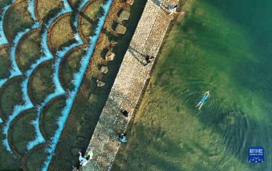 7月11日,人們?cè)诤贾菖R安高虹鎮(zhèn)的龍鱗壩戲水(無(wú)人機(jī)照片)。