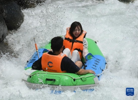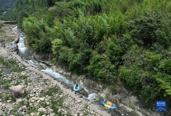 7月11日,人們?cè)诤贾菖R安龍崗鎮(zhèn)浙西大龍灣體驗(yàn)峽谷漂流。