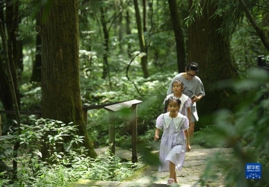 7月11日,人們?cè)诤贾菖R安天目山風(fēng)景區(qū)游玩。