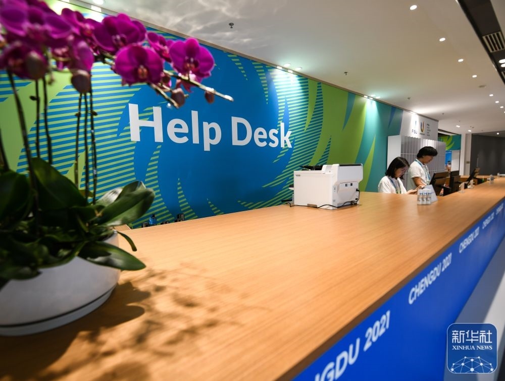 ↑7月13日,在成都大運會主媒體中心,工作人員正在服務(wù)臺工作。新華社記者 王曦 攝
