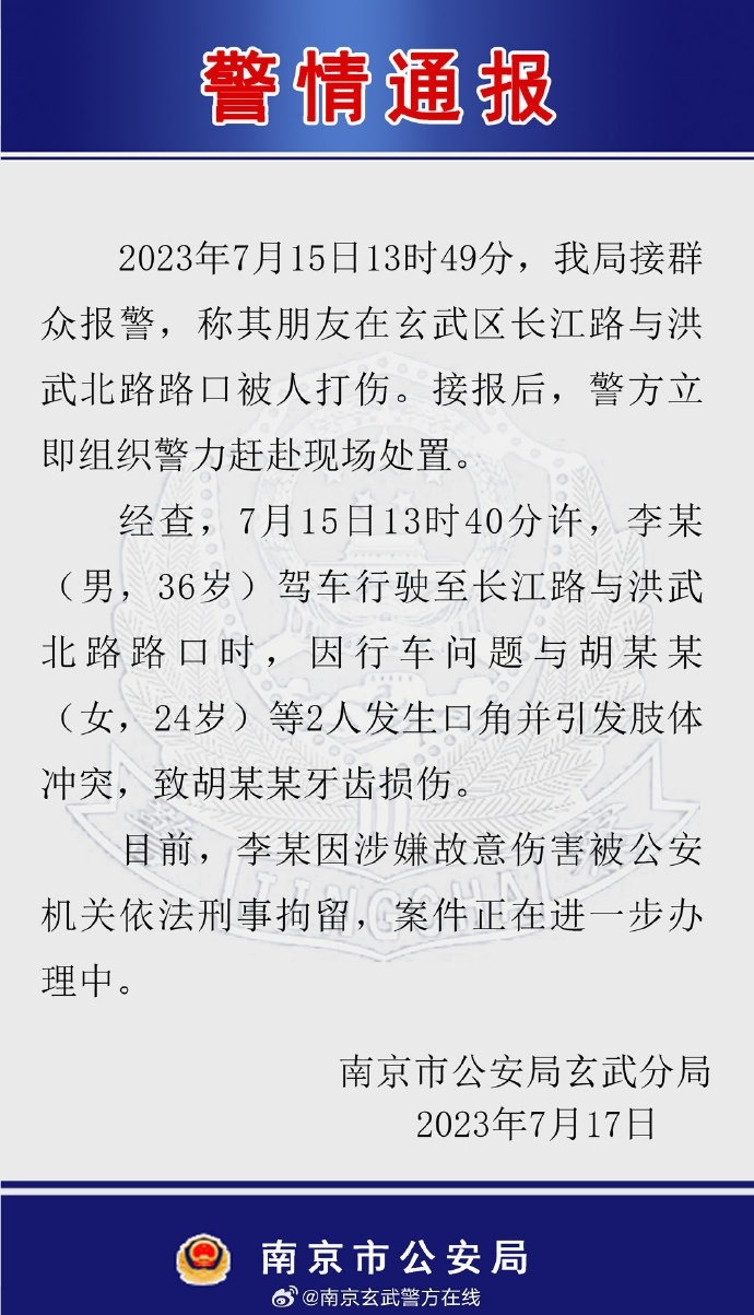 ·警方通報南京街頭怒路打斗:被打女子牙齒損傷,打人者被刑拘。