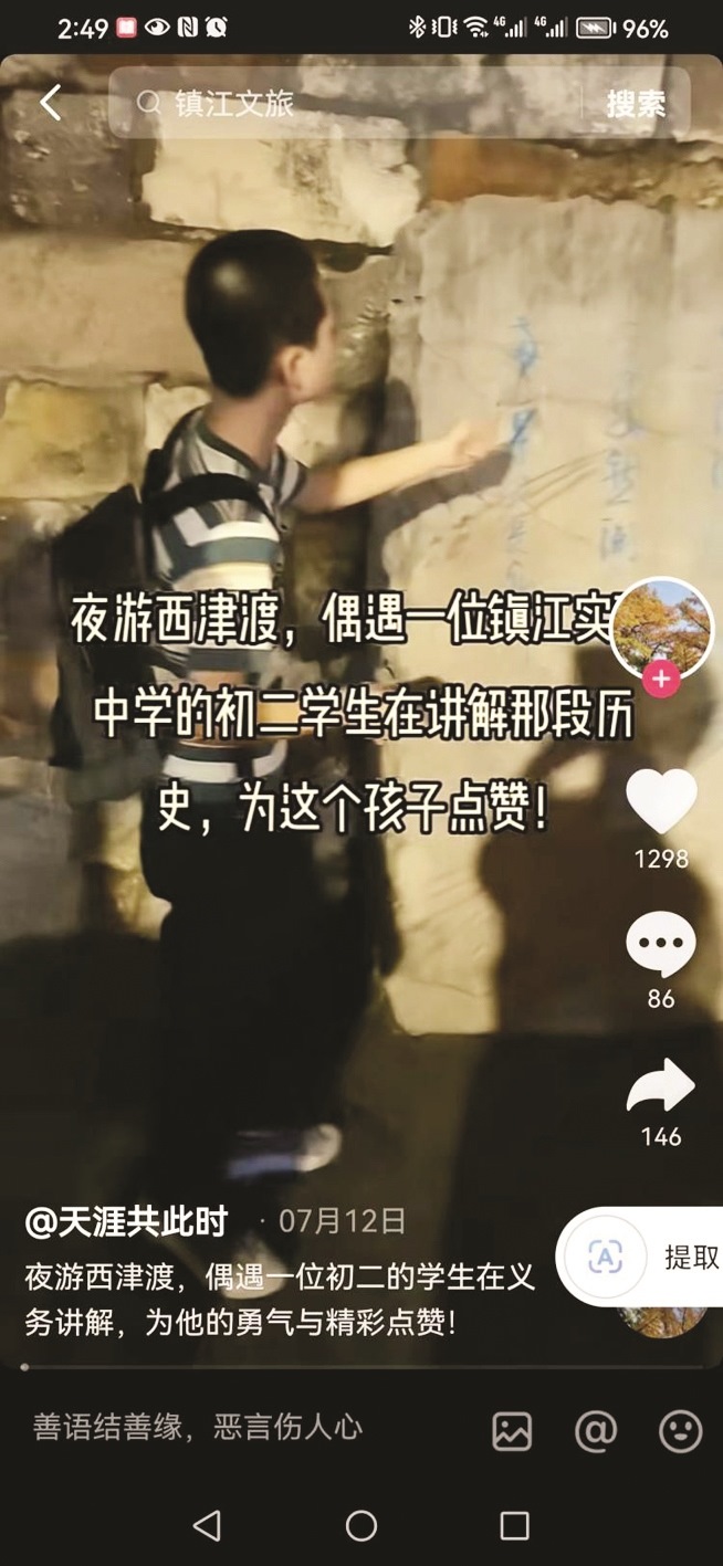 揚(yáng)子晚報(bào)訊(記者 萬凌云 通訊員 湯婉蓉 孫冬)“人類的歷史與功績會(huì)隨著時(shí)間而消失。但是中國將在他們身上繼續(xù)存在,我們將保持他們高舉的旗幟……”7月22日,一段鎮(zhèn)江初中學(xué)生講解歷史的視頻爆火,他們的講解地位于歷史底蘊(yùn)深厚的鎮(zhèn)江西津渡景區(qū)。