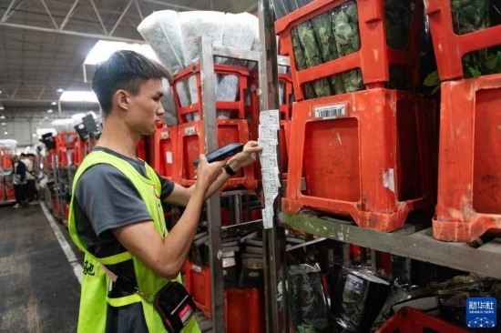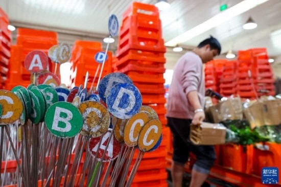 一名工作人員在昆明國際花卉拍賣交易中心內(nèi)對臺車上存放的鮮花進(jìn)行掃碼(7月13日攝)。新華社記者 陳欣波 攝