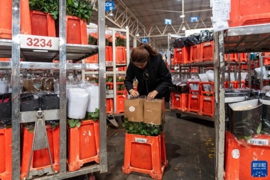 在云天化晉寧花卉產(chǎn)業(yè)現(xiàn)代化示范園內(nèi),花農(nóng)對鮮花進(jìn)行簡單打包(7月12日攝)。新華社記者 陳欣波 攝
