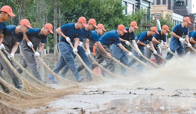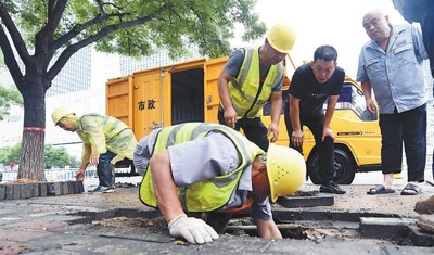 8月10日,河北省廊坊市市政人員搶修因暴雨破裂的管道。邵玉姿 孫寶宇攝影報(bào)道