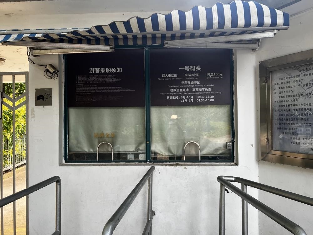 當(dāng)記者問起是否有現(xiàn)金購買渠道時,工作人員指路了附近的人工售票窗口,同時補(bǔ)充道:“收受現(xiàn)金的售票員有時會離開崗位,不久會回來?!庇浾咴诖说赝A袅艘恍r,注意到長風(fēng)公園內(nèi)類似的售票窗口有兩個,營業(yè)至16:30。然而,整整一個小時內(nèi),兩個窗口均無人在崗。