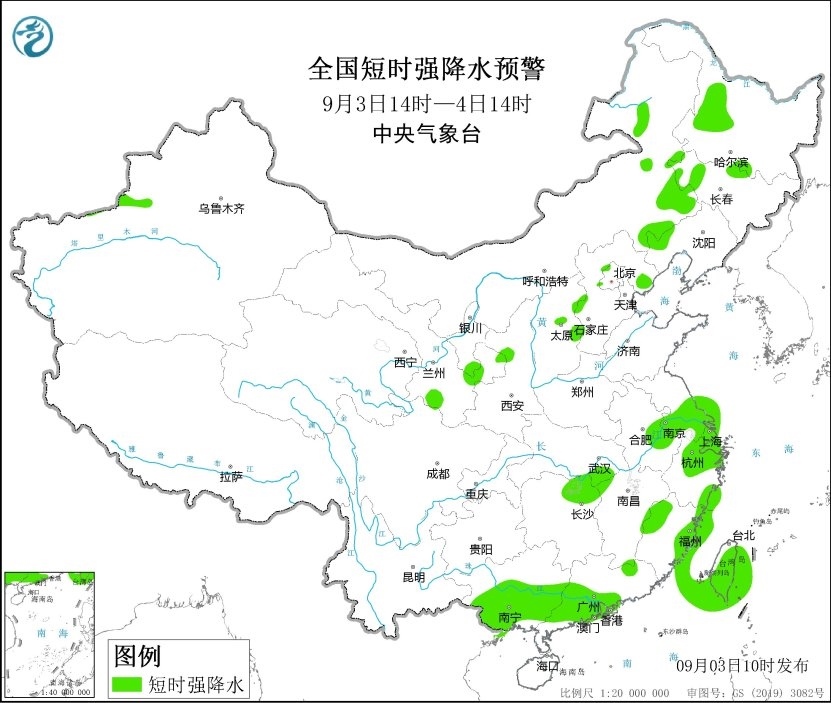 預(yù)計9月3日14時至4日14時,內(nèi)蒙古東南部、吉林西部、遼寧西部、山西中部、河北中部和東北部以及福建東部和西北部、廣西南部和東南部沿海、臺灣島等地的部分地區(qū)將有8-10級雷暴大風(fēng)或冰雹天氣,局地可達(dá)11級以上;內(nèi)蒙古東部、黑龍江西部、吉林西部、遼寧西部、甘肅南部、山西中部、河北西部和東北部、江蘇中南部、安徽東部、上海、浙江北部、福建東部和西北部、廣西南部、廣東西南部、臺灣島等地的部分地區(qū)將有短時強(qiáng)降水天氣,最大小時雨量20-50毫米,局地可達(dá)70毫米以上。