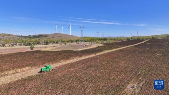 10月1日,在沽源縣白土窯鄉(xiāng)小西溝村,當?shù)剞r(nóng)機手正在田間操作收割機收獲藜麥(無人機照片)。