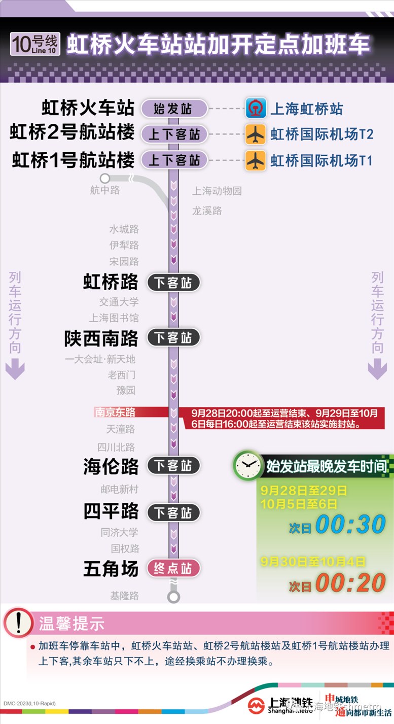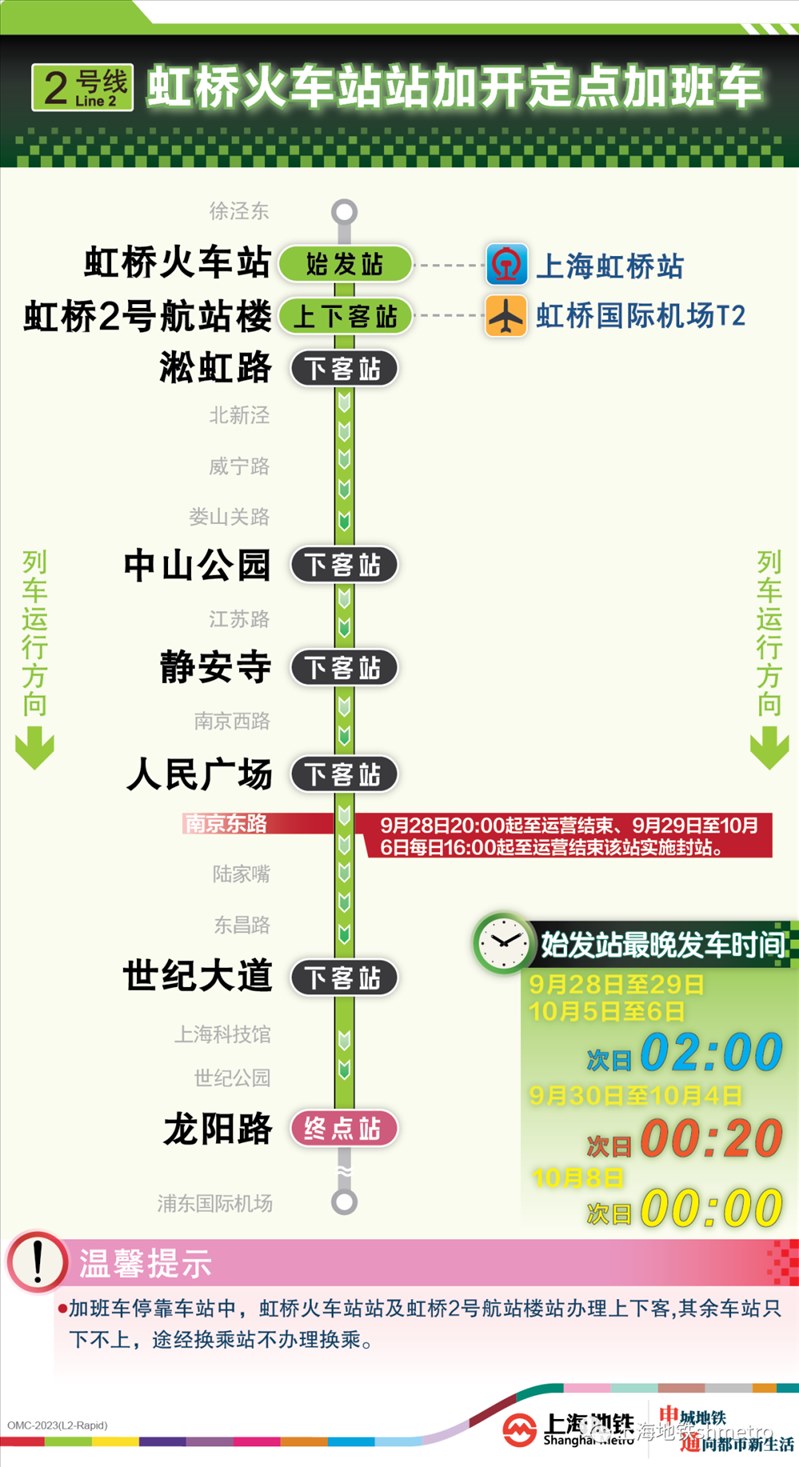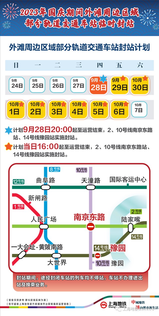 此外,9月28日20:00至運營結束,以及9月29日至10月6日的每日16:00至運營結束,地鐵2、10號線南京東路站,14號線豫園站計劃實施封站跳停。