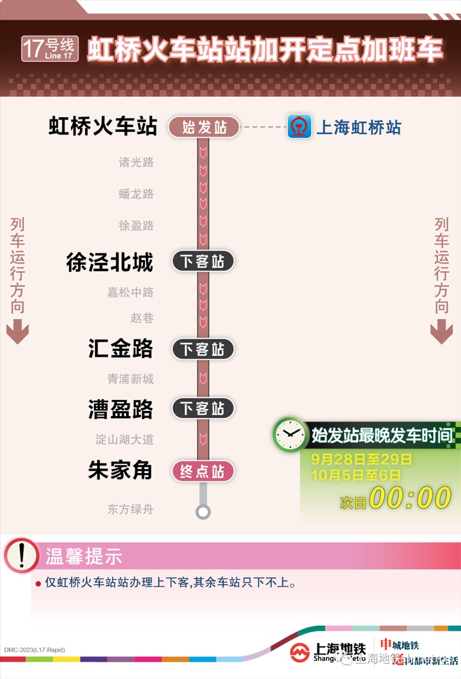 根據鐵路虹橋站夜間到達列車開行情況,9月28日、9月29日、10月5日、10月6日,鐵路在原夜間圖定計劃的基礎上增加了開行班次。為應對鐵路臨時加開,做好虹橋火車站夜間列車集中到達大客流疏散工作,虹橋樞紐相關的地鐵2、10、17號線在既定延時或加開方案的基礎上進一步增開定點加班車。其中,9月28日至29日、10月5日至6日夜間,虹橋火車站定點加班車最晚發(fā)車時刻為:2號線至次日2:00、10號線至次日0:30、17號線至次日0:00。同時,9月30日至10月4日,2號線和10號線虹橋火車站定點加班車發(fā)車時刻推遲至次日0:20。
