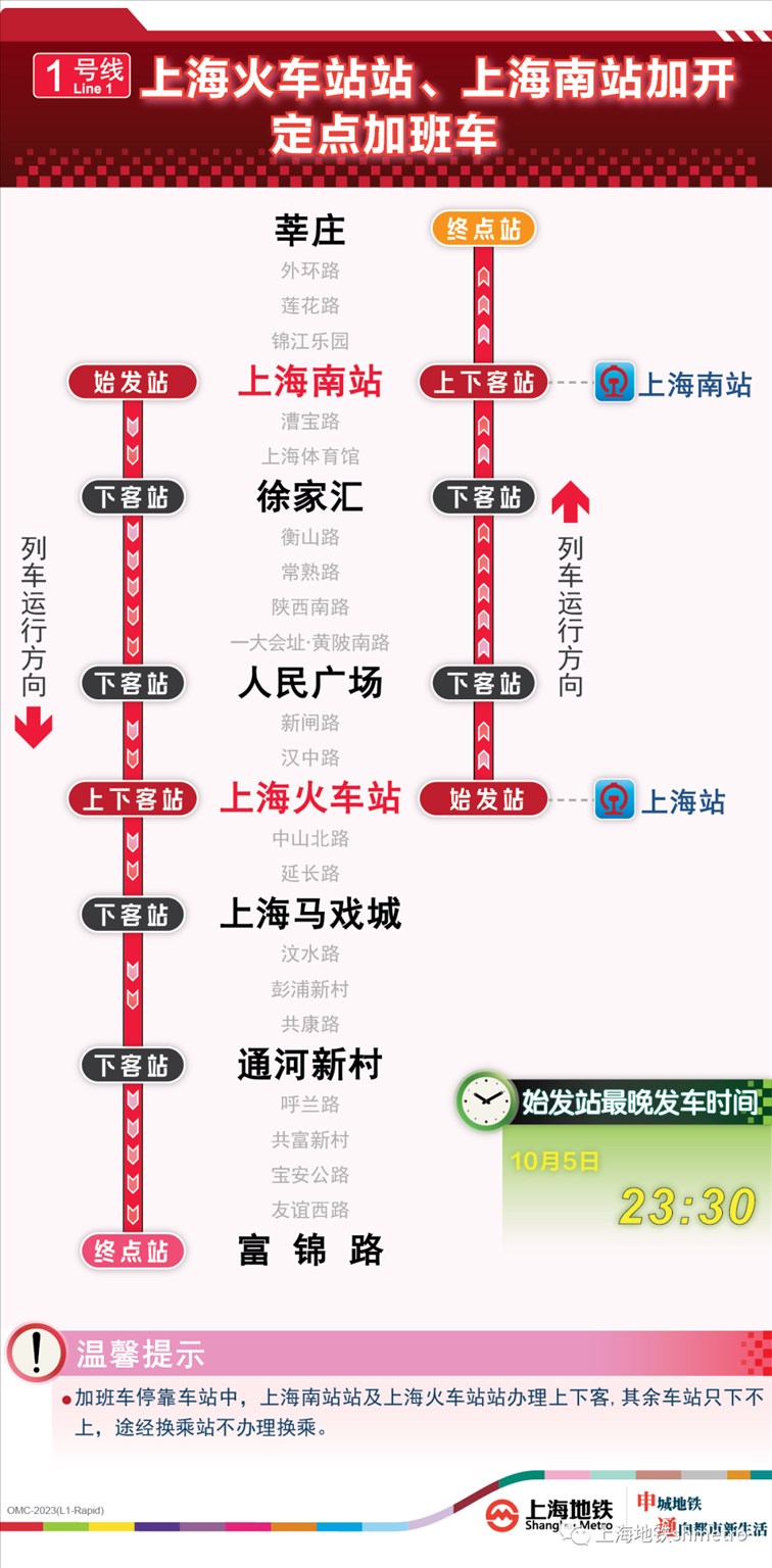 此外為做好節(jié)假日返程期間上?;疖囌尽⒑鐦蚧疖囌?、上海南站的夜間客流疏散工作,10月5日,地鐵1號線在圖定基礎上實施定點加開方案,加開末班車發(fā)車時間至23:30;另10月8日地鐵2號線增加定點加班車班次,加開末班車發(fā)車時間至次日0:00。