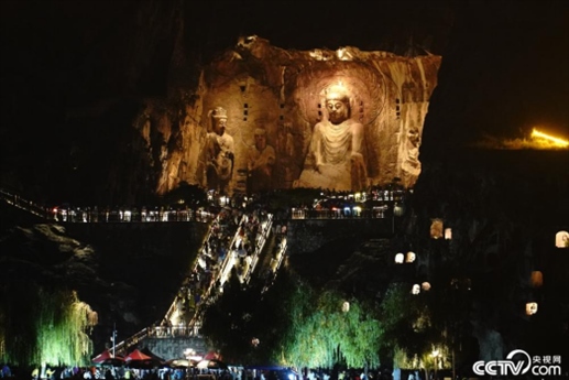 國(guó)慶假期,河南洛陽龍門石窟開啟夜游模式,吸引大量游客參觀游覽。