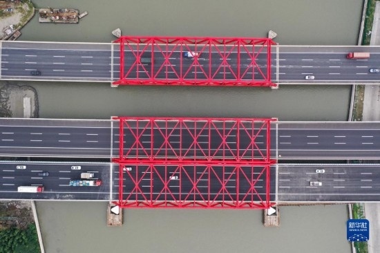 10月10日,車輛通過滬寧高速公路青陽港大橋(無人機(jī)照片)。