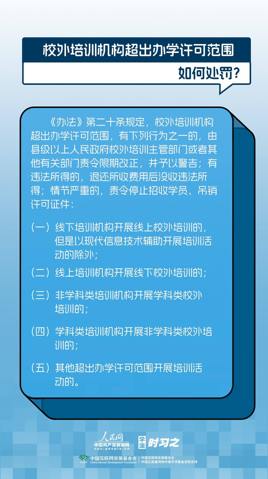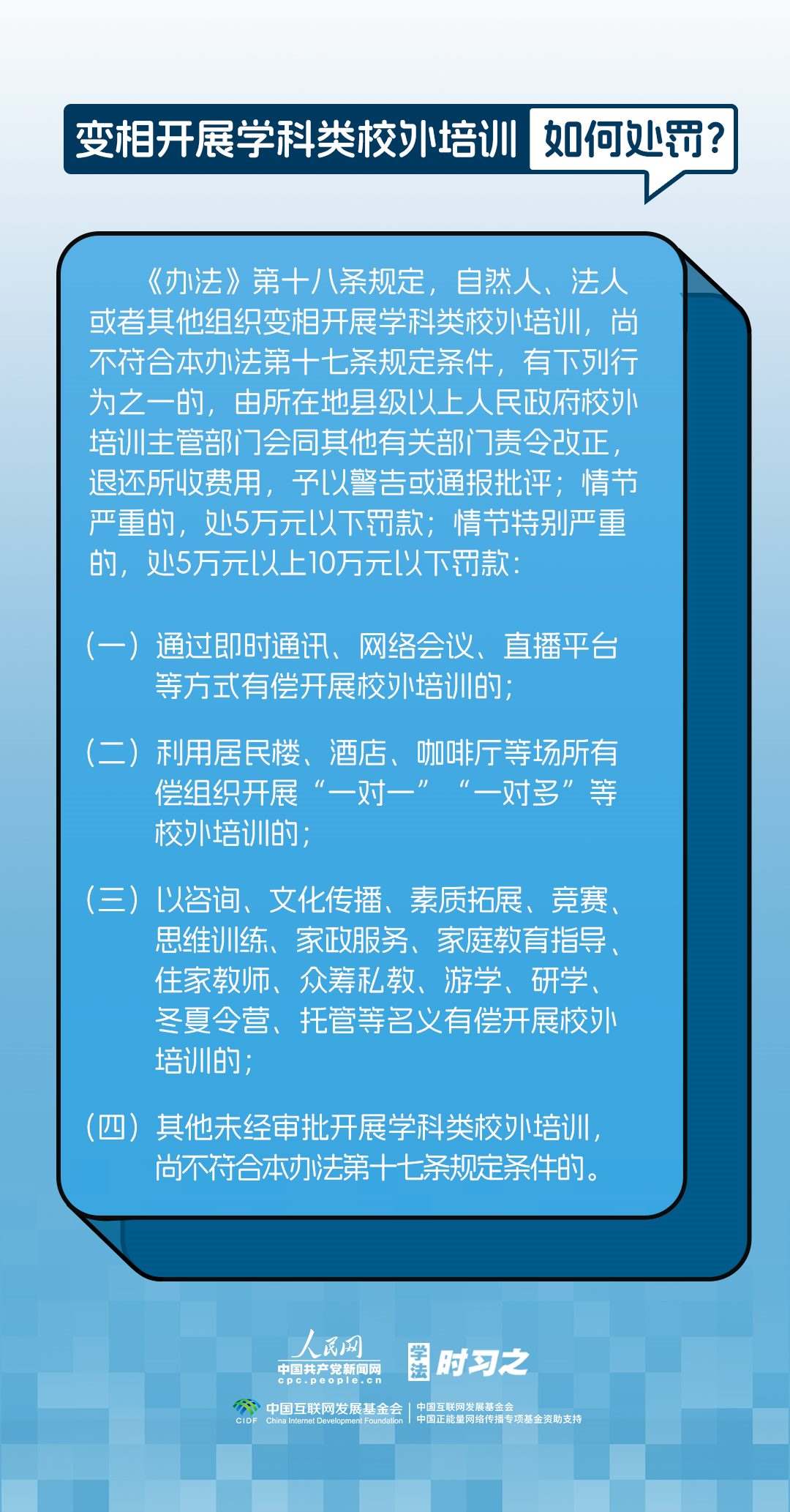 《校外培訓(xùn)行政處罰暫行辦法》(以下簡稱《辦法》)將于2023年10月15日起施行。《辦法》提出了校外培訓(xùn)行政處罰總體要求。規(guī)定適用對象為面向社會招收3周歲以上學(xué)齡前兒童、中小學(xué)生,違法開展校外培訓(xùn)的自然人、法人或者其他組織。要求校外培訓(xùn)行政處罰應(yīng)當(dāng)遵循公正、公開的原則,堅持處罰與教育相結(jié)合,引導(dǎo)自然人、法人或者其他組織自覺守法,共同抵制校外培訓(xùn)違法行為,營造有利于學(xué)生成長成才的良好環(huán)境。