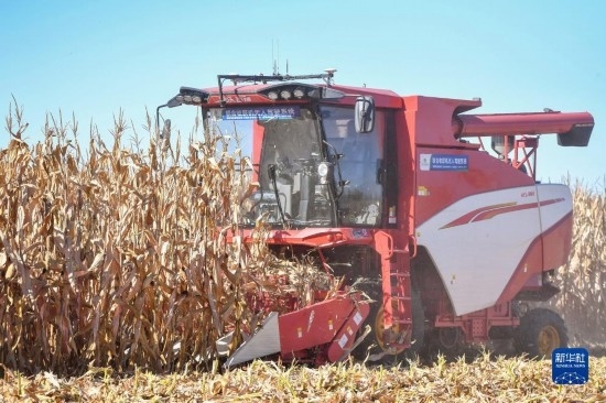 10月19日,在中國科學(xué)院“黑土糧倉”科技會(huì)戰(zhàn)長春示范區(qū)公主嶺示范基地,無人駕駛農(nóng)機(jī)在收獲玉米。