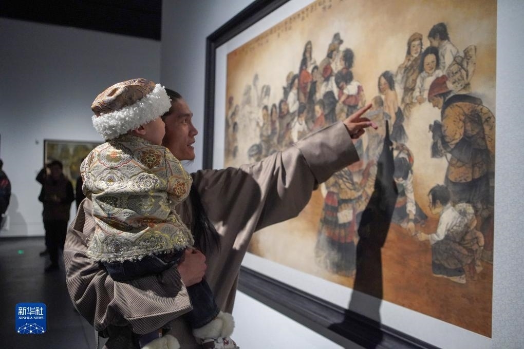 11月15日,觀眾在西藏美術(shù)館參觀畫作《草原紀(jì)事》?!⌒氯A社記者 邵澤東 攝