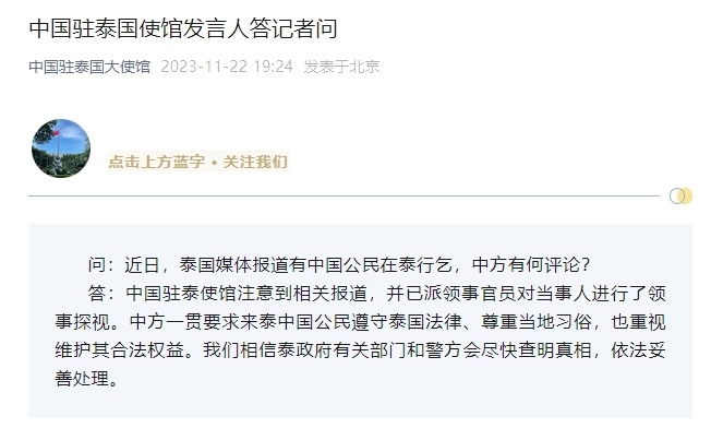 ·中國駐泰國大使館回應(yīng)網(wǎng)傳有中國公民在泰行乞:注意到相關(guān)報道,并已派領(lǐng)事官員對當(dāng)事人進行了領(lǐng)事探視。
