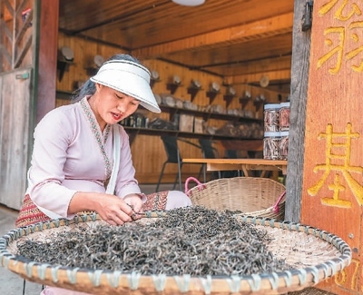 景邁山翁基古寨的布朗族茶農(nóng)在挑揀茶葉。