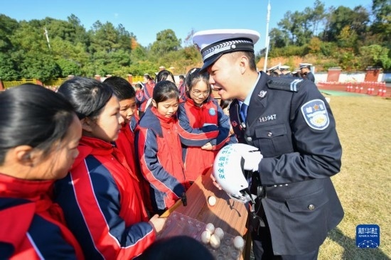 當(dāng)日,長沙市公安局望城分局交警大隊(duì)的民警走進(jìn)農(nóng)村地區(qū)學(xué)校,通過交警手勢演示、鐵騎技能展示、交通標(biāo)識(shí)競答、頭盔碰撞模擬體驗(yàn)、汽車盲區(qū)體驗(yàn)等多種形式,開展道路交通安全宣傳活動(dòng),幫助學(xué)生們提高交通安全意識(shí)。