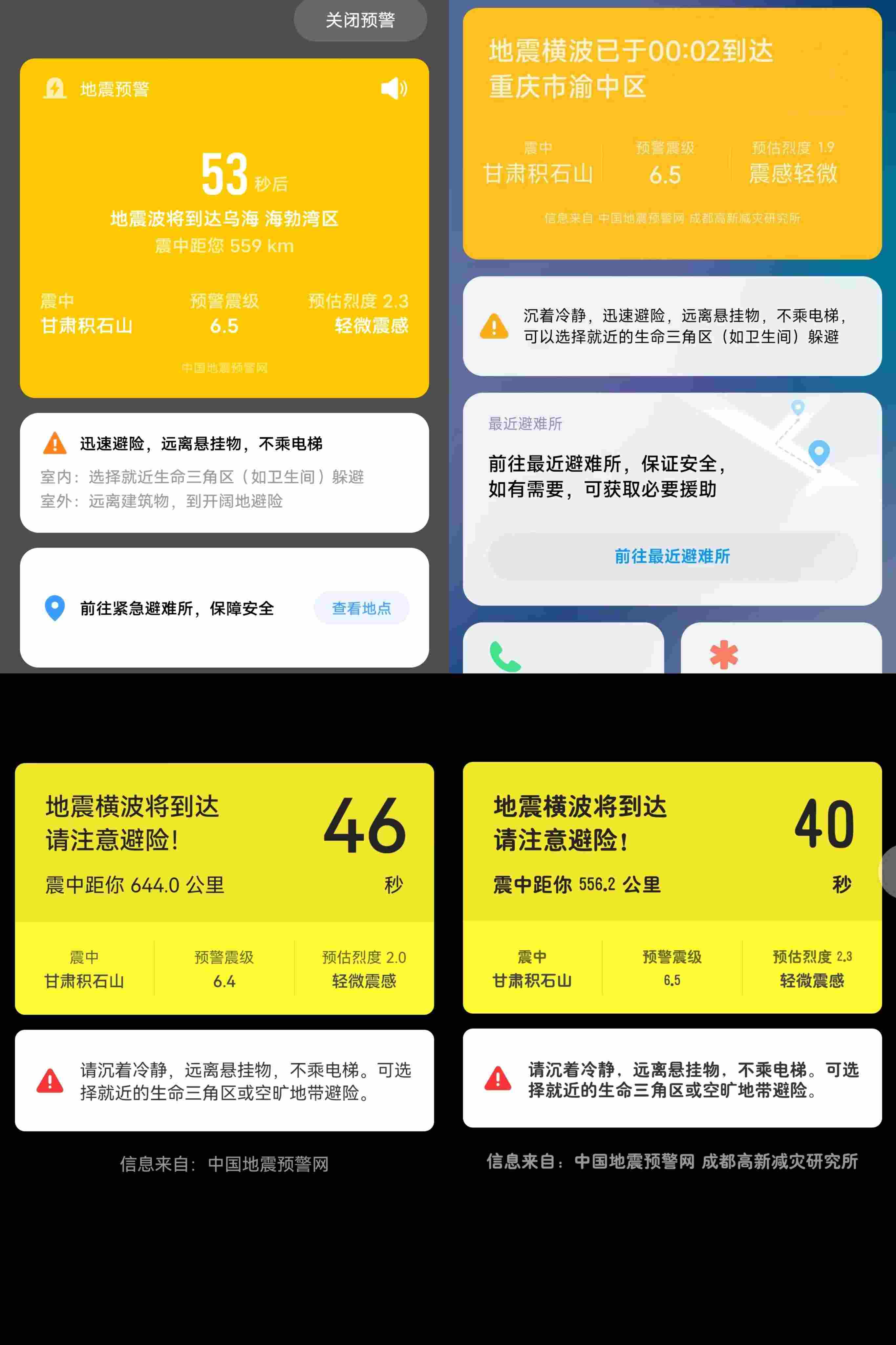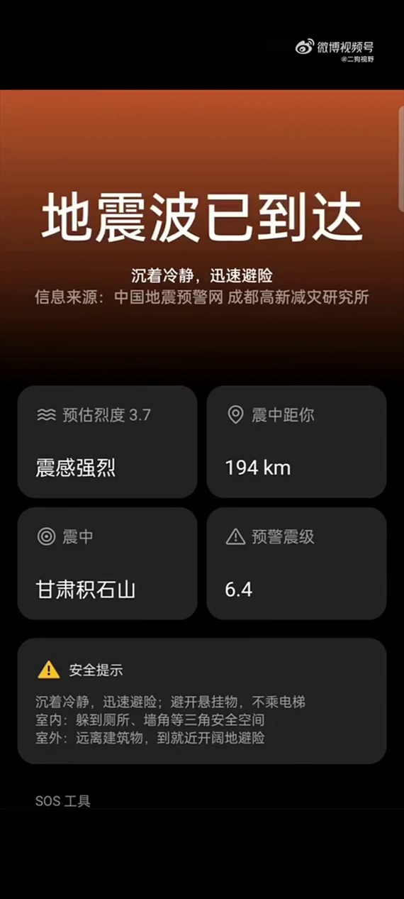 除甘肅地區(qū)外,很多周邊地區(qū)的居民也都及時收到了地震預警: