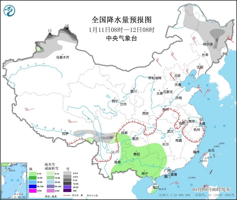 1月10日08時(shí)至11日08時(shí),新疆北疆北部、內(nèi)蒙古東北部、黑龍江中西部等地的部分地區(qū)有小到中雪或雨夾雪,其中新疆阿勒泰、塔城的部分地區(qū)有大雪,局地暴雪(10~18毫米);四川南部和東部、重慶西部、湖南西南部、貴州、廣西、云南東部的等地的部分地區(qū)有小到中雨。內(nèi)蒙古中東部、東北地區(qū)南部、河北北部、山東半島、浙江、西藏等地的部分地區(qū)有4~6級風(fēng),其中浙江東部等地的部分地區(qū)風(fēng)力可達(dá)7級以上;渤海北部、渤海海峽、黃海南部、東海、臺灣海峽、臺灣以東洋面、巴士海峽、南海中北部等海域有6~7級風(fēng)、陣風(fēng)8~9級(見圖2)。