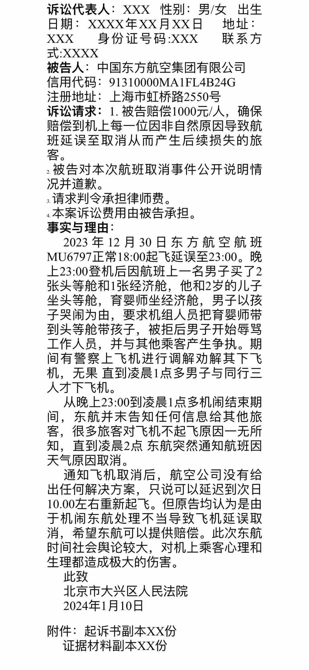 群內發(fā)出的起訴書寫道:“從當日23點到次日凌晨1點多機鬧結束期間,東航并未告知任何信息給其他旅客,很多旅客對飛機不起飛原因一無所知,直到凌晨2點,東航突然通知航班因天氣原因取消。通知飛機取消后,航空公司沒有給出任何解決方案,只說可以延遲到次日10點左右重新起飛。但原告均認為是由于機鬧,東航處理不當,導致飛機延誤取消,希望東航可以提供賠償。此次東航事件社會輿論較大,對機上乘客心理和生理都造成極大的傷害?!睋?jù)悉,乘客們擬起訴至北京市大興區(qū)人民法院。