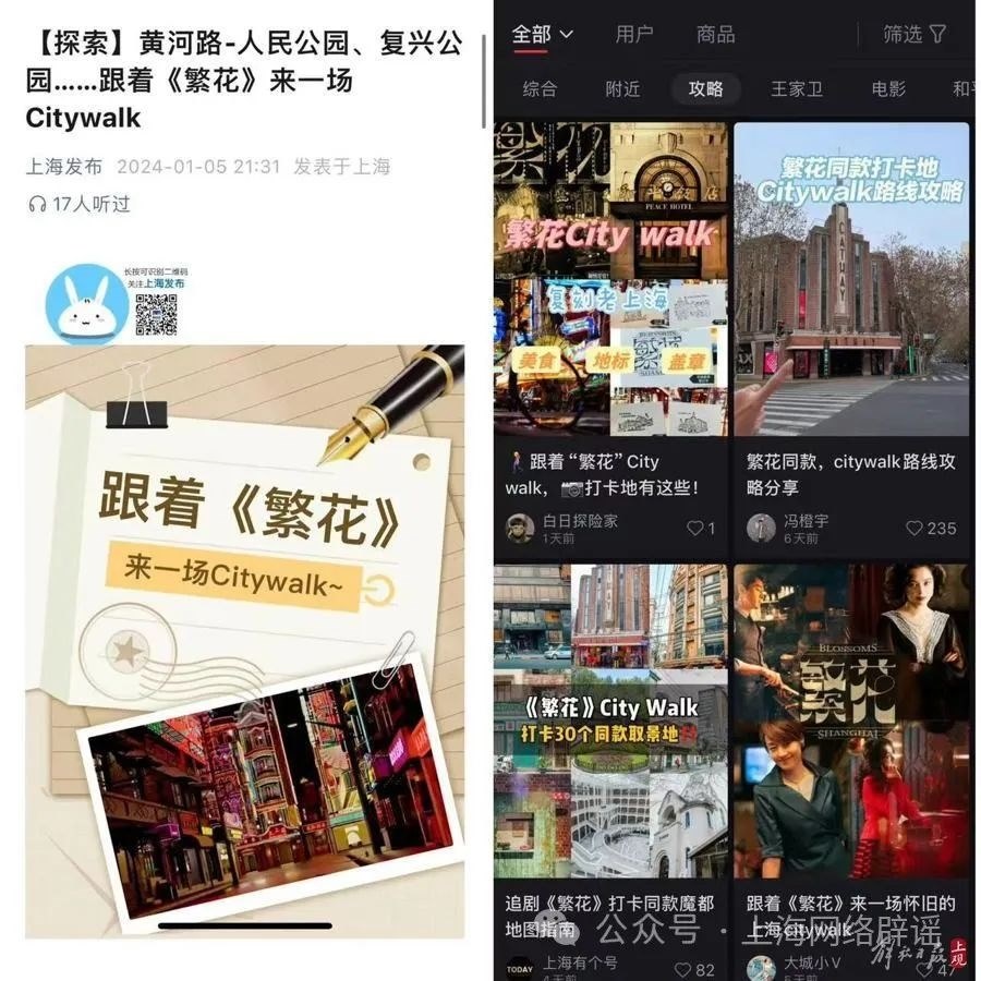 為此,上海辟謠平臺以“上海Citywalk”“繁花Citywalk”等為關(guān)鍵詞,搜索了多家旅游服務(wù)在線平臺、社交平臺,都沒有發(fā)現(xiàn)主播們引用的“3公里Citywalk收費(fèi)520元”圖片,也沒有看到與“繁花Citywalk”相關(guān)的收費(fèi)服務(wù)。