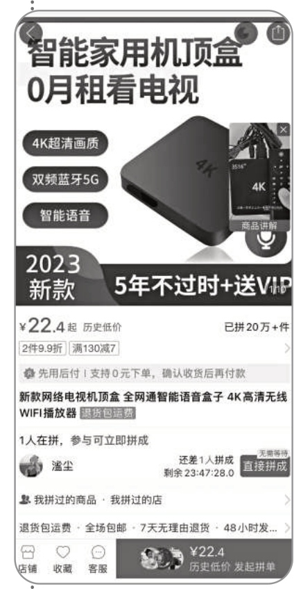 “0月租看電視”“這是一款可以讓你一輩子不用交有線電視費(fèi)的機(jī)頂盒”……在電商平臺上,一款網(wǎng)絡(luò)電視機(jī)頂盒各型號版本已售出超過20萬件,在同類商品中銷售量最高。記者購買了一款售價(jià)47.88元的型號,套裝內(nèi)包括機(jī)頂盒、配件以及永久會員。
