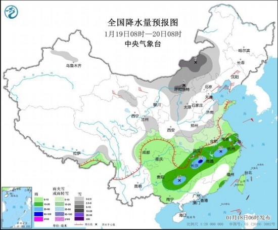 1月18日08時至19日08時,新疆北部、西北地區(qū)東部、內(nèi)蒙古中西部、黃淮西部和南部、江淮北部、湖北西北部以及西藏東部等地部分地區(qū)有小到中雪或雨夾雪,局地有大雪。江淮南部、江漢東部、江南北部和西部、西南地區(qū)東南部等地部分地區(qū)有中到大雨,其中,湖北南部、湖南東北部和西部等地部分地區(qū)有暴雨(50~60毫米)。內(nèi)蒙古東南部、遼寧大部、華北東部、山東半島、江南東部等地部分地區(qū)有4~6級風(見圖1)。