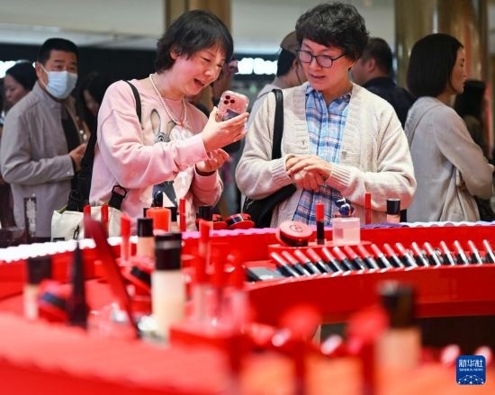 消費(fèi)者在海口國(guó)際免稅城選購(gòu)化妝品(2月11日攝)。