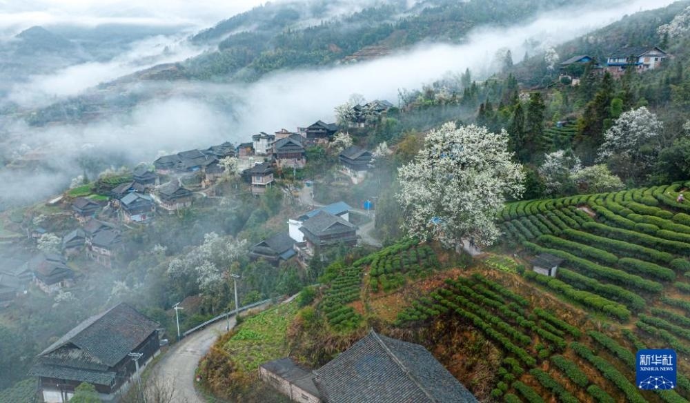 春到茶鄉(xiāng),廣西三江侗族自治縣的村寨、山花與茶園構(gòu)成美麗的田園圖畫(huà)。?
