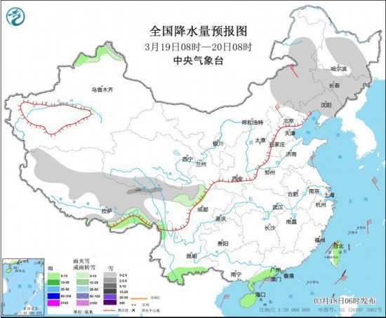 全國降水量預(yù)報(bào)圖(3月18日08時(shí)-19日08時(shí))