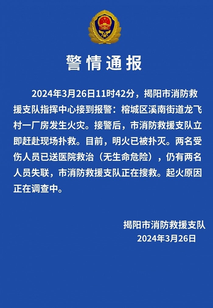 央視網(wǎng)消息:據(jù)“揭陽(yáng)發(fā)布”微信公眾號(hào)消息,揭陽(yáng)市消防救援支隊(duì)發(fā)布警情通報(bào),2024年3月26日11時(shí)42分,揭陽(yáng)市消防救援支隊(duì)指揮中心接到報(bào)警:榕城區(qū)溪南街道龍飛村一廠(chǎng)房發(fā)生火災(zāi)。接警后,市消防救援支隊(duì)立即趕赴現(xiàn)場(chǎng)撲救。目前,明火已被撲滅。兩名受傷人員已送醫(yī)院救治(無(wú)生命危險(xiǎn)),仍有兩名人員失聯(lián),市消防救援支隊(duì)正在搜救。起火原因正在調(diào)查中。