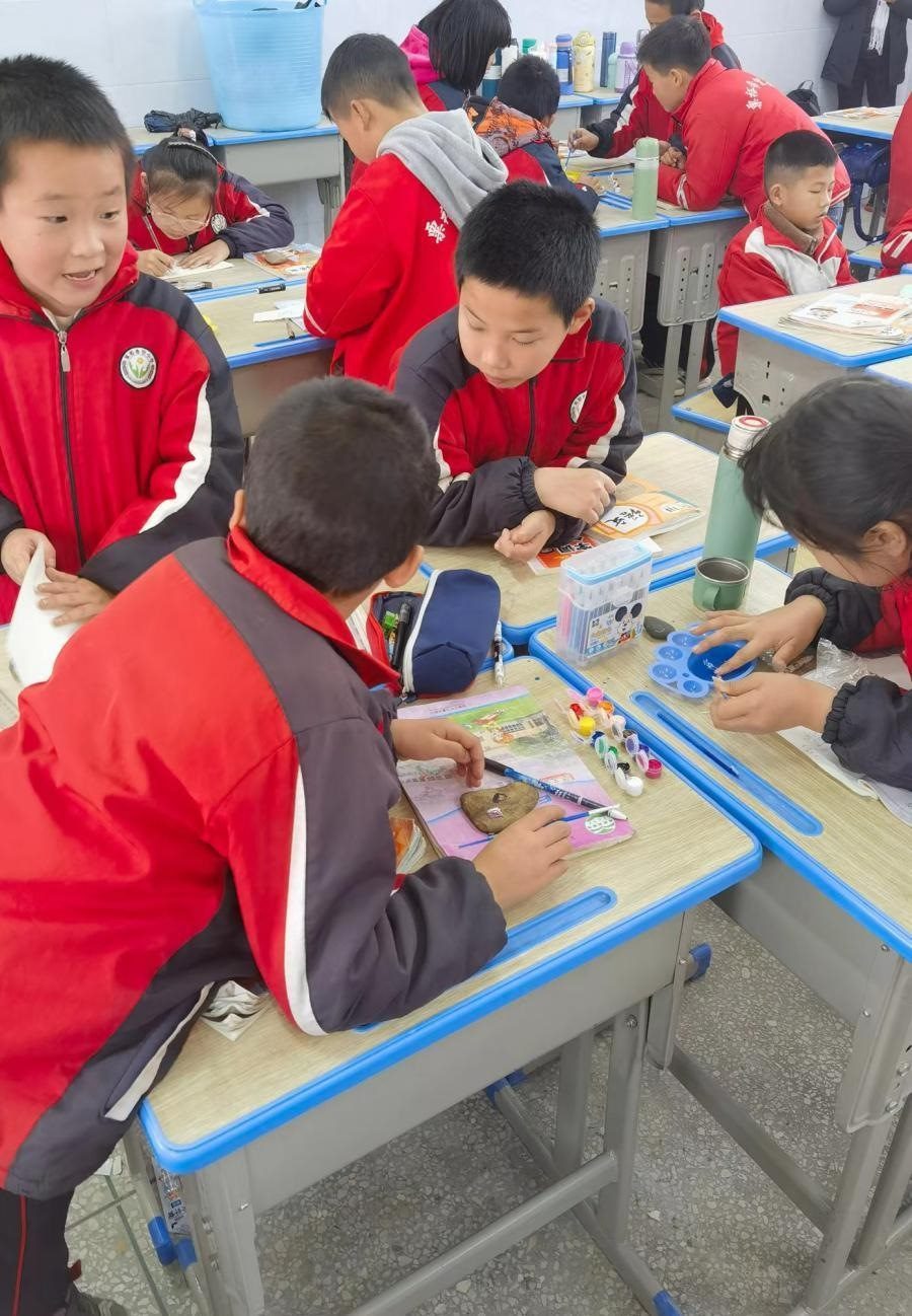 美術(shù)課上,李柏霖讓孩子們?cè)谑^上作畫