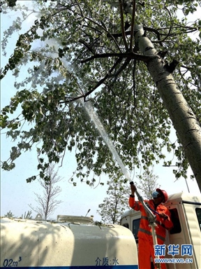 圖六:在北京豐臺(tái)區(qū),一名工作人員用高壓水槍對(duì)楊樹雌株進(jìn)行噴水濕化以減少飛絮。(來源:新華社)