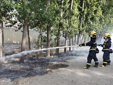 圖三:2023年5月2日,河南省濟(jì)源市消防救援支隊(duì)濟(jì)瀆路特勤站在處置飛絮引發(fā)的火情(來源:新華社)
