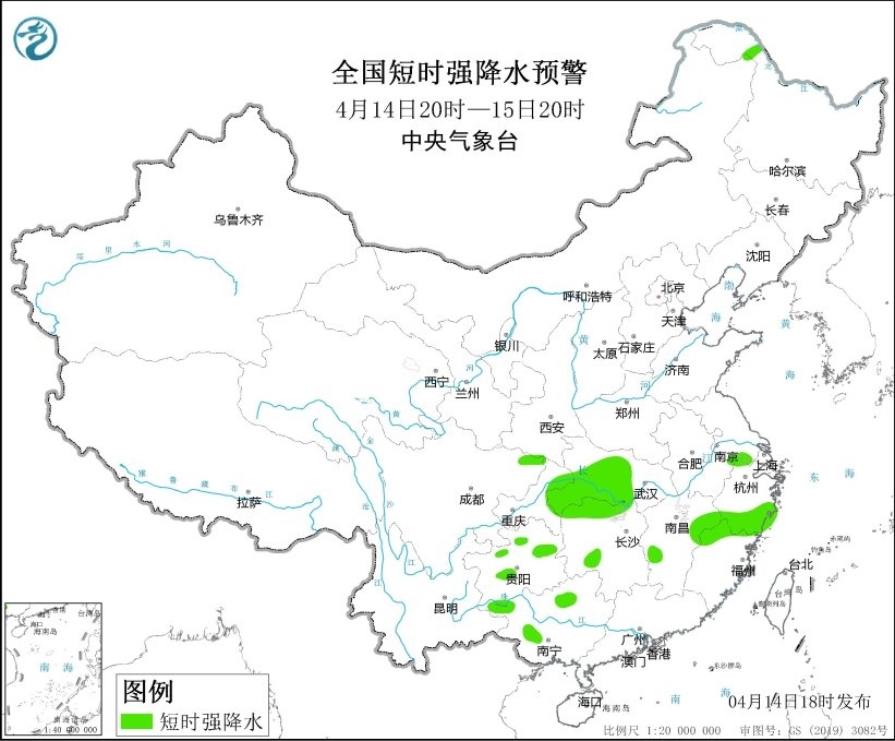 預計4月14日20時至15日20時,遼寧西部、河北北部、山東東部、湖北南部和西部、湖南北部和西南部、江西東北部、浙江中南部、福建西北部、四川盆地東北部、重慶東北部、貴州中部和北部、廣西西北部等地的部分地區(qū)將有8-10級雷暴大風或冰雹天氣;江蘇西南部、湖北中南部、湖南北部和西南部、江西西部和東北部、浙江南部、福建西北部、重慶東北部、貴州中北部、廣西西部和東北部等地的部分地區(qū)將有短時強降水天氣,最大小時雨量20-40毫米,局地可達50毫米以上。